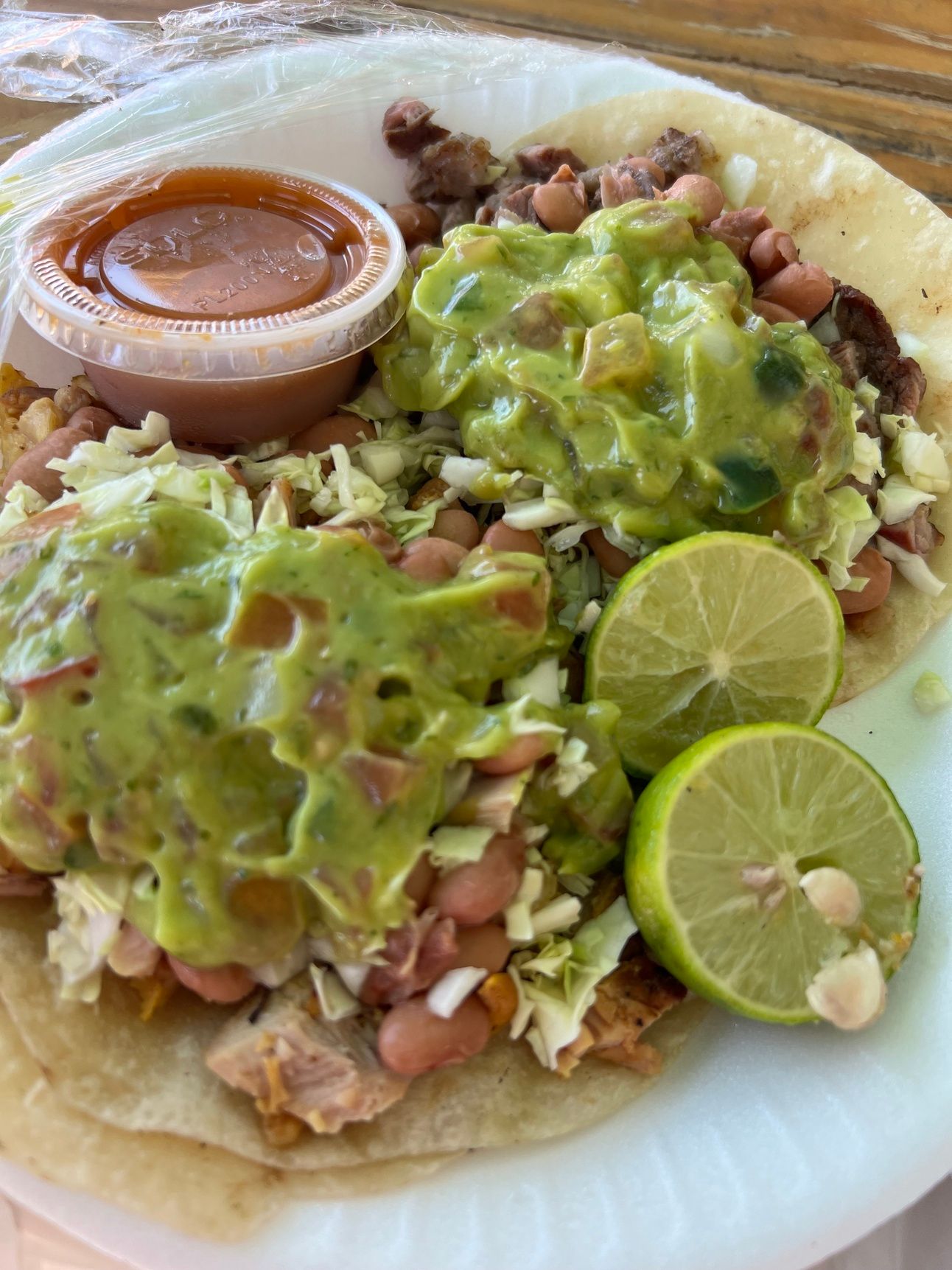 Fresh grilled chicken and steak tacos, with pinto beans, guacamole and lime.