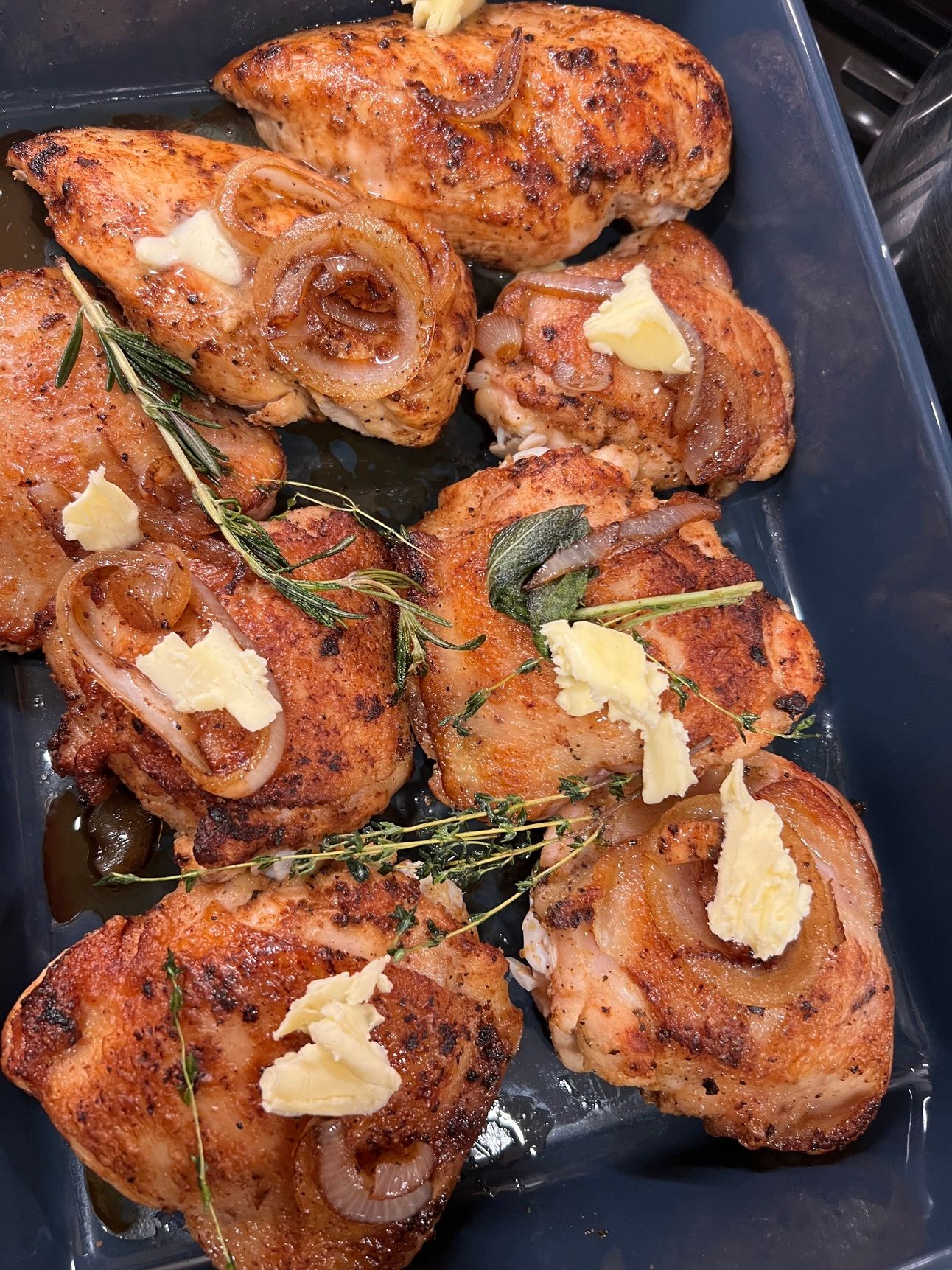 Chicken thighs in rosemary and butter, made by me in September 2024.