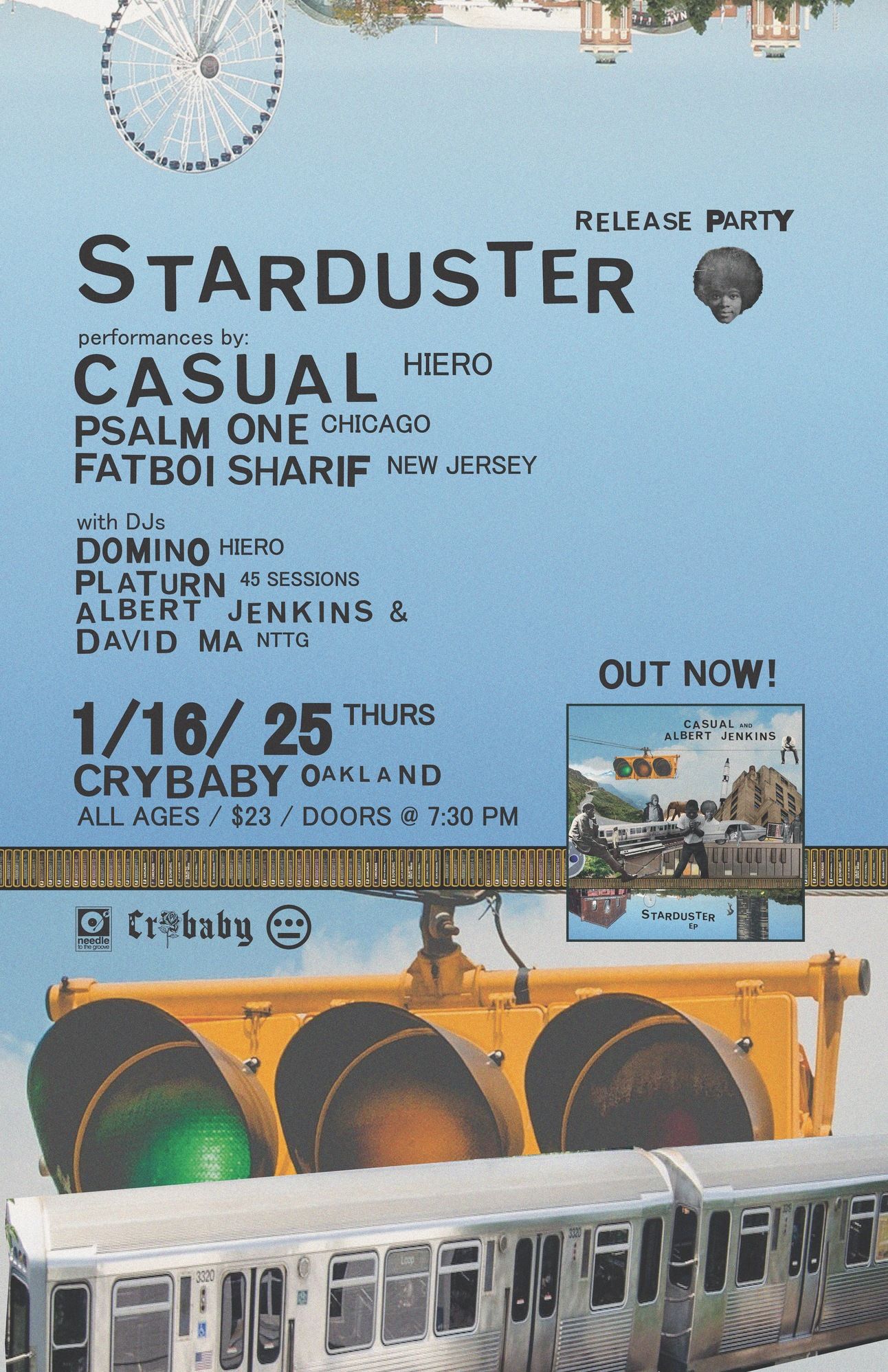 I’ll be celebrating “Starduster,” the latest EP from legendary emcee Casual and Albert Jenkins at Crybaby Oakland in January! This is gonna be one for the books. With Fatboi Sharif, Domino, David Ma and more! Get tickets HERE.